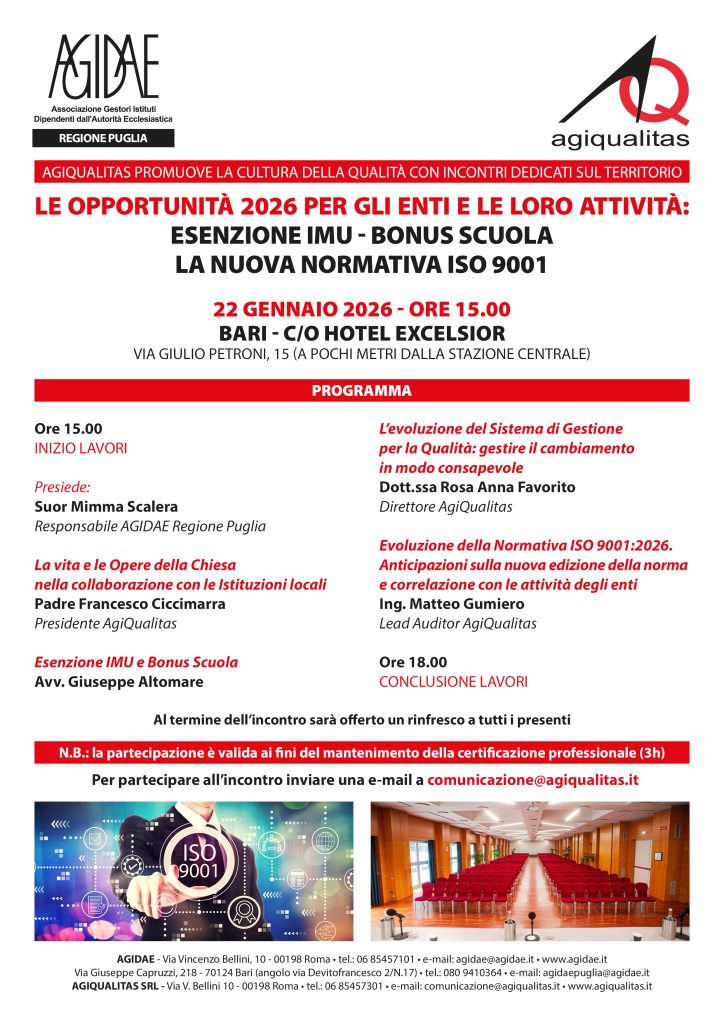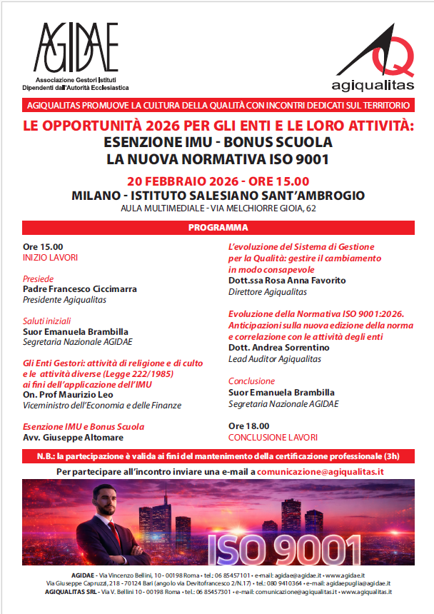 Fondata nel 2003 per iniziativa di Agidae, Agiqualitas è un Organismo di Certificazione di terza parte indipendente accreditato ACCREDIA. La sua nascita risponde all’esigenza di offrire alle istituzioni educative, socio-assistenziali e di accoglienza un modello di certificazione del Sistema di Gestione per la Qualità capace di coniugare competenza tecnica e attenzione alla persona. Da oltre vent’anni Agiqualitas opera per diffondere la cultura della qualità come strumento di crescita, innovazione e miglioramento continuo, mettendo sempre al centro la mission e i valori delle organizzazioni che scelgono questo percorso virtuoso.